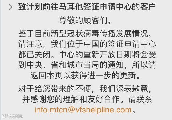 【马耳他】中国境内所有城市的马耳他签证申请中心暂时关闭,恢复办公时间以相关部门通知为准。