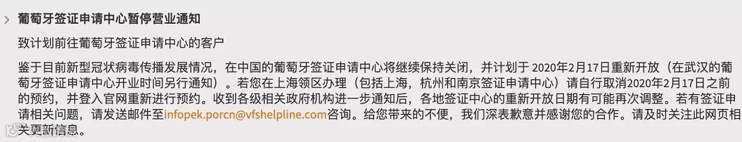 【葡萄牙】中国境内所有城市的葡萄牙签证申请中心延长关闭时间至2020年2月16日,2月17日当天恢复营业。