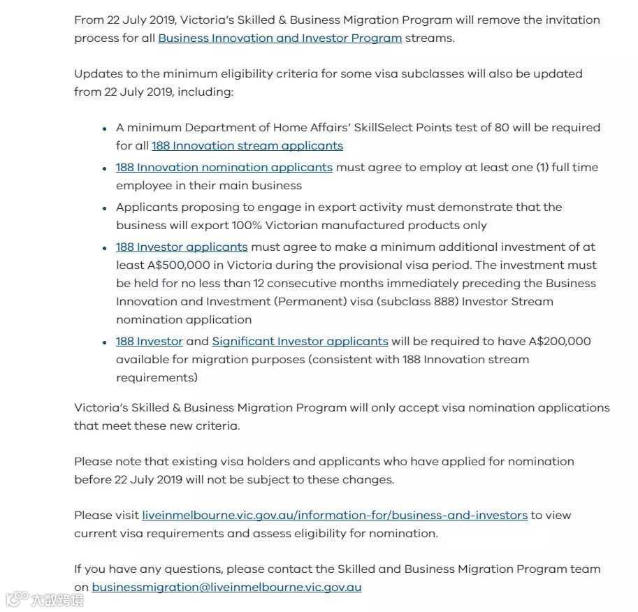 2019年7月22日起,维多利亚投资移民州担保新政: