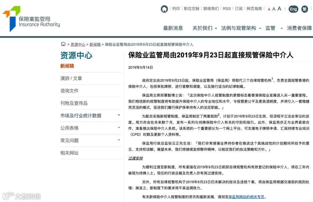 香港保险业监管局最新发布:从2019年9月23日起,保险业监管局(保监局)将取代三个自律规管机构(保险代理登记委员会、香港保险顾问联会及香港专业保险经纪协会),负责全面规管香港的保险中介人,包括审批牌照、进行查察和调查,以及施行适当的纪律制裁。这次保险中介人规管制度的更替标志着香港保险业进入另一重要里程。