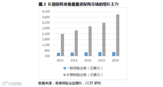 香港保险业务分为长期保险业务和一般保险业务。长期保险业务包括个人人寿业务(占94.7%)、团体人寿及退休计划业务、年金及其他业务,长期保险业务近年来快速增长,2016年长期保险业务保费约占香港保费总收入的90%,长期个人人寿业务是香港保险市场的主流产品。