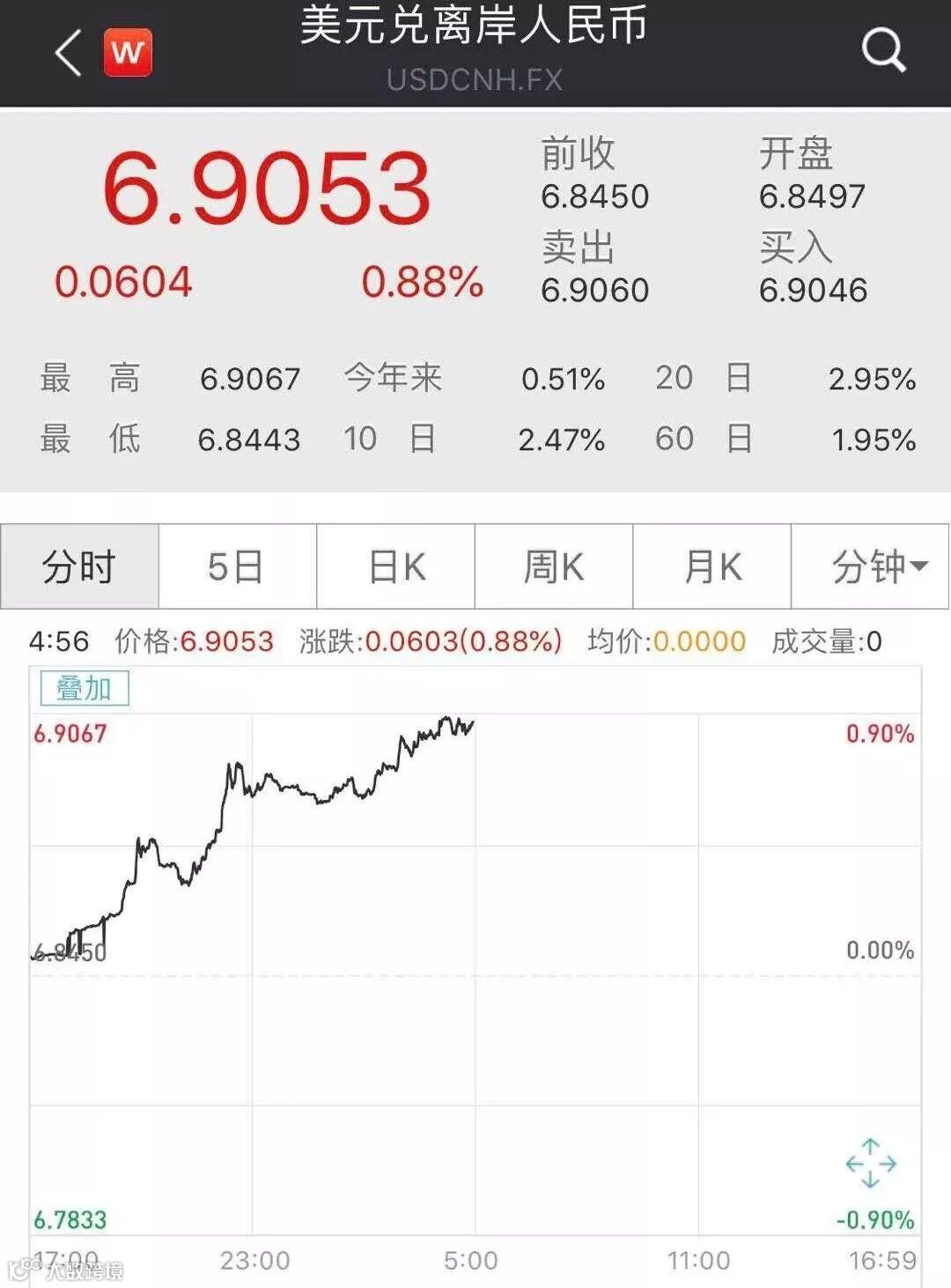 5月13日,离岸人民币汇率跌破6.90关口,创12月以来新低,先后破6.85、6.86、6.87、6.88、6.89关口。