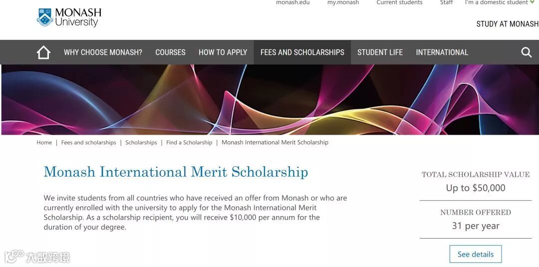 每年$10,000澳币的奖学金哦!仅限31人。最高额度$50,000澳币。只要是收到offer或者在读的国际留学生都有机会申请哦!