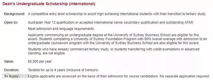 悉尼大学的各个学院每年会为成绩优秀的学生提供优秀奖学金哦!每个学院都有名目繁多的奖项;每个奖的评选方式和金额也各有不同,从几千到上万不等。例如,商学院奖学金: