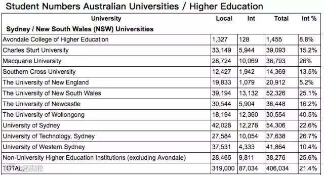 以悉尼大学为例,2017年本地生(即澳洲公民及持有澳洲绿卡的学生)有42,028人,国际留学生仅有12,278人。留学生占全体生源的比例仅为22.6%。