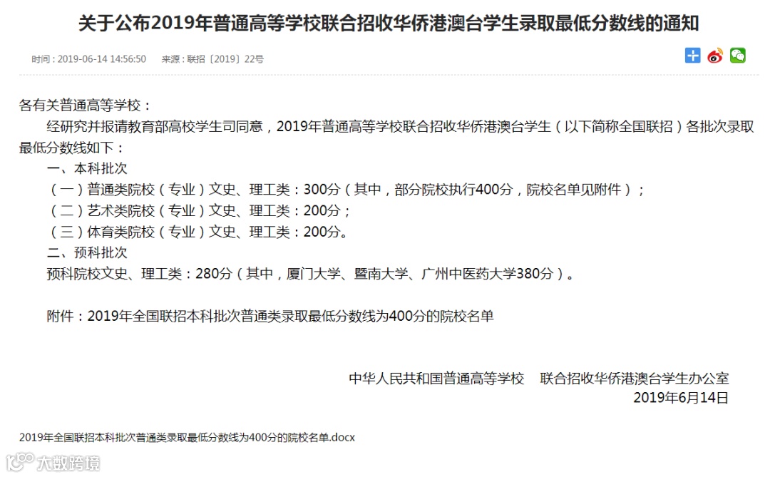 根据政策,2019年中国普通高等学校华侨港澳台联考招生控制分数线如下: