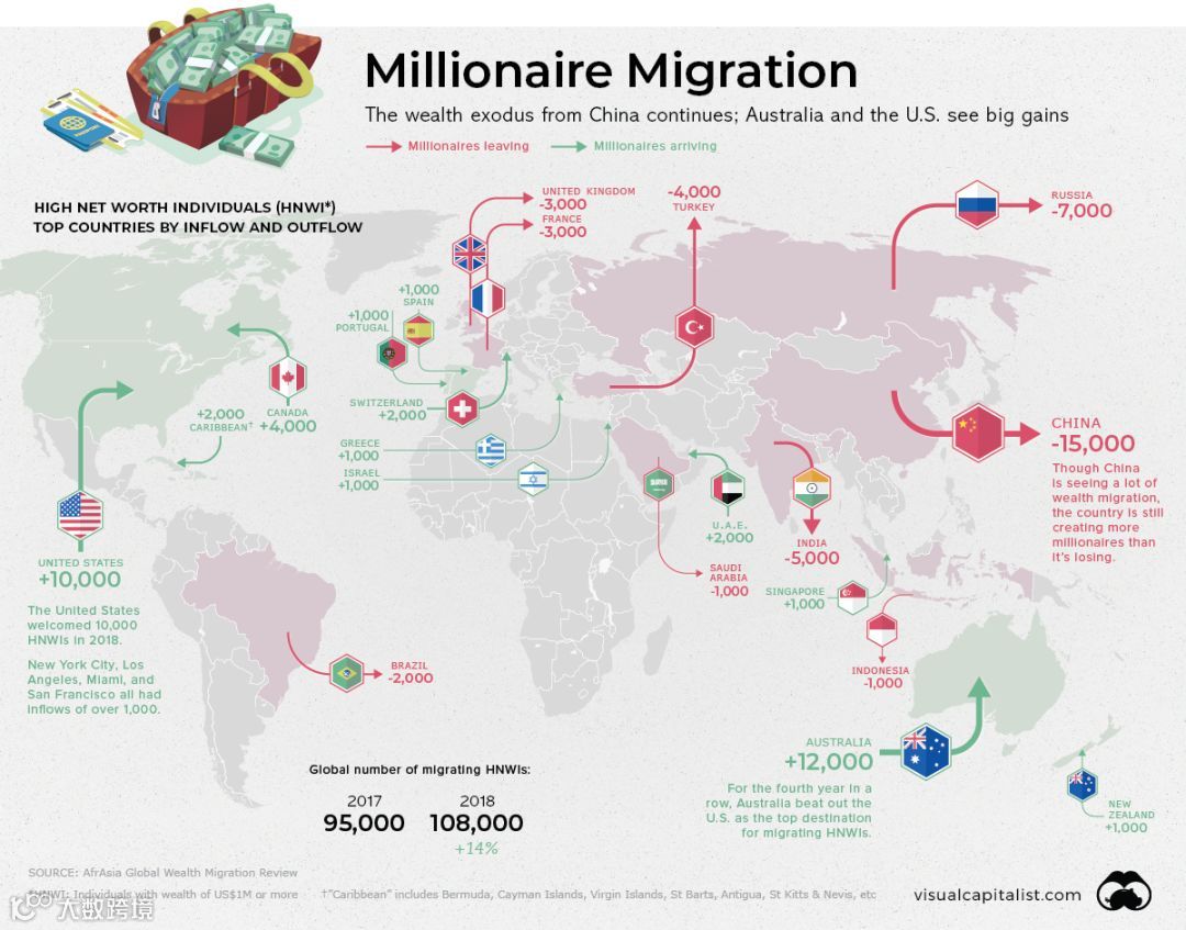 国际咨询公司Knight Frank发表的《2019年财富报告》、亚非银行Afrasia Bank的《全球财富移民述评》和全球市场研究集团新世界财富就揭露了目前全球财富集中分布图、富豪移民流动趋势和原因解析。