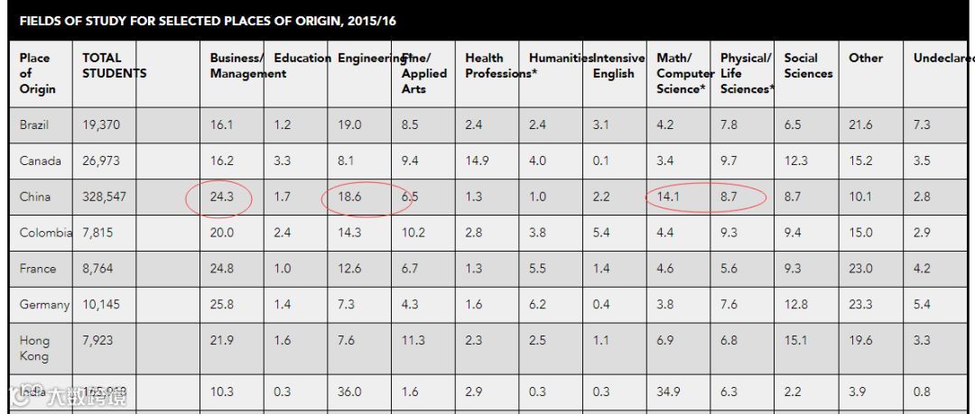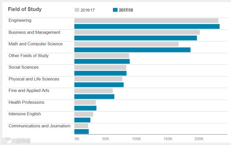 无论是在美国的国际学生,还是来自中国大陆地区的学生,选择理科和工程都占据较大的比重。根据OPEN DOOR2017/2018年数据显示,所有美国国际学生中,就读人数第一的是工程类专业、第二的是商科和管理专业,而就读数学和计算机科学专业的学生排名第三,如果把排名第一的工程专业和排名第三的数学和计算机专业加在一起,比例会更高。