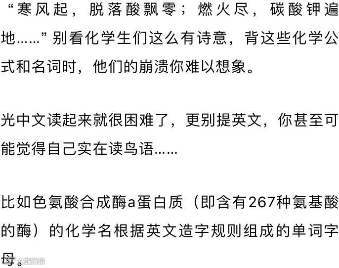 虽然这只是个段子,但每天面对着庞大的词汇量、繁重的试验任务,化学专业的学生真是令人心疼。