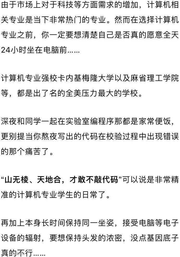 其实每个人对于压力的理解和感受都是不同的,任何一个专业都有可能成为使你“头秃”的专业,而关键在于你是否能够锻炼自己的抗压能力,学会在繁重的学业中放松自己。