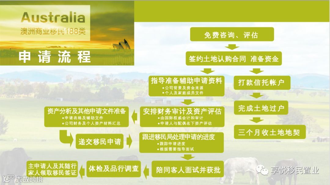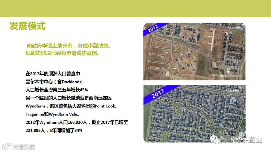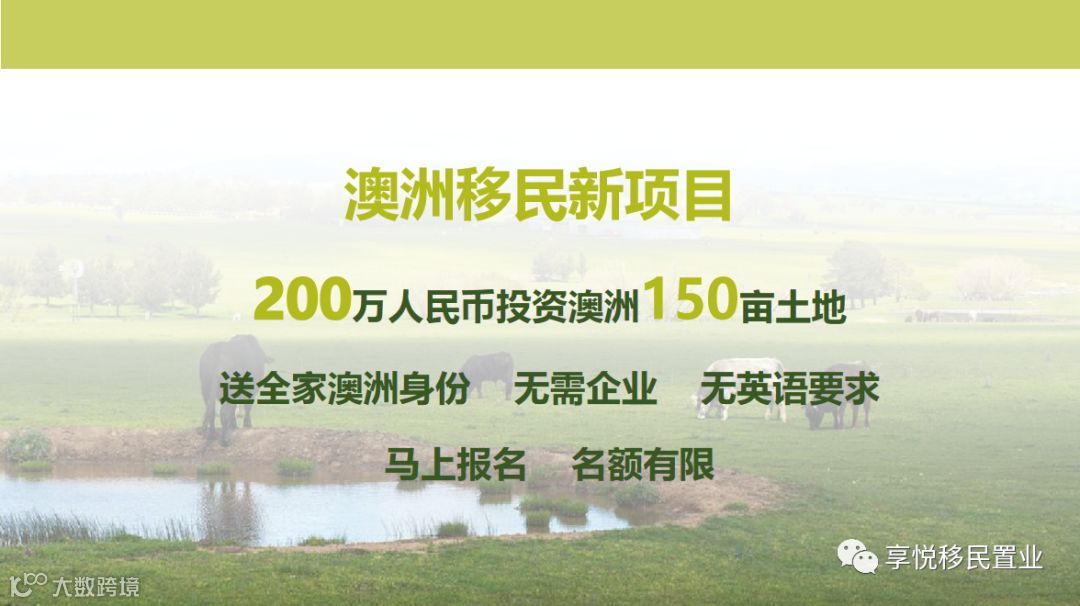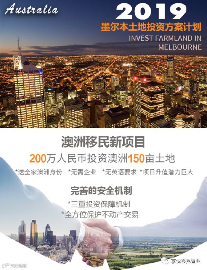 目前,享悦正推出200万人民币投资移民项目,送150亩墨尔本永久产权地块和全家澳洲身份。土地位于墨尔本西部偏北,离墨尔本CBD 90分钟程,“地”美价廉,无限升值空间。