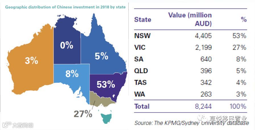 中国人在澳洲最热衷的投资地是新南威尔士州和维多利亚州,其中2018年在维多利亚州的投资额达到21.99亿澳币。