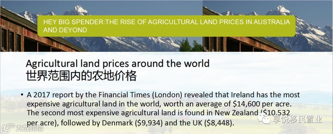 英国伦敦胡金融时报在2017年胡一篇报道中提到,爱尔兰的农场价格是全球最高的,达到每英亩14,600英镑,紧随其后的是新西兰农场,达到每英亩10,532英镑,其次要丹麦,达到每英亩9,934英镑和英格兰本土的每英亩8,448英镑。