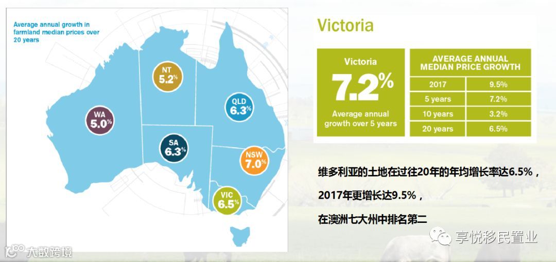 来自澳洲权威机构RURAL BANK 的分析报告指出,澳洲土地价值连续20年增长,维多利亚的土地在过往20年的年均增长率达6.5%,2017年更增长达9.5%,在澳洲七大州中排名第二。