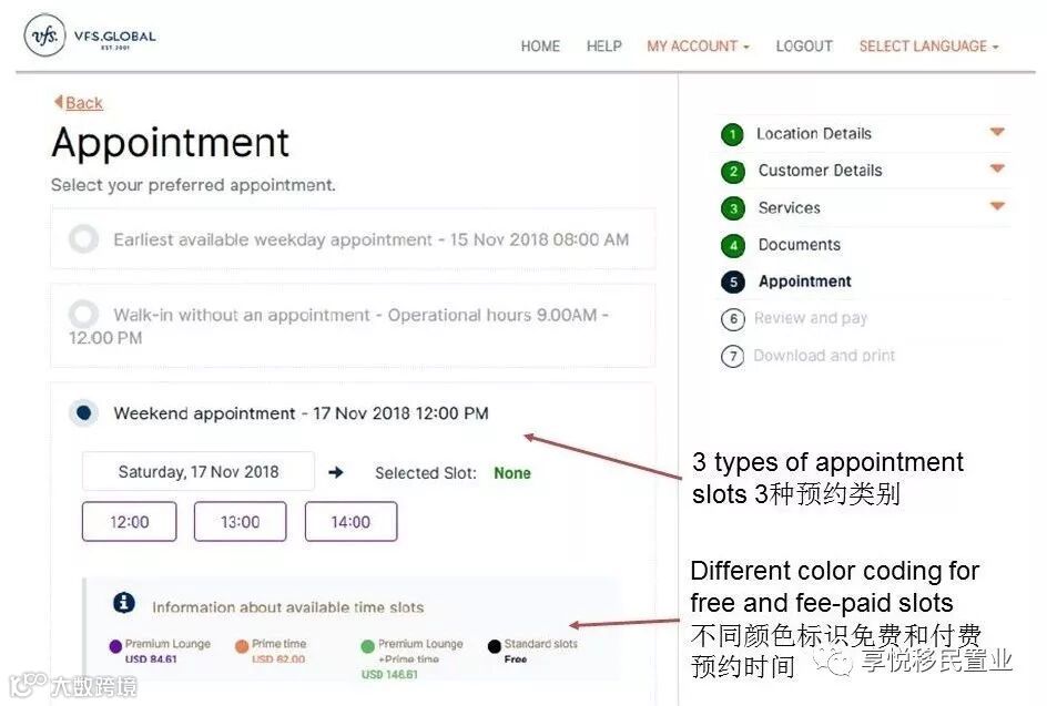 点击黄色continue后,进入预约环节,预约有三个不同类型:第一个是普通预约;第二个是不预约,直接前往签证申请中心;第三个是选择周六、日的预约时间。预约普通工作日不收取费用,直接去签证申请中心和预约周末时间有额外收费,由不同颜色标识,可按需选择。