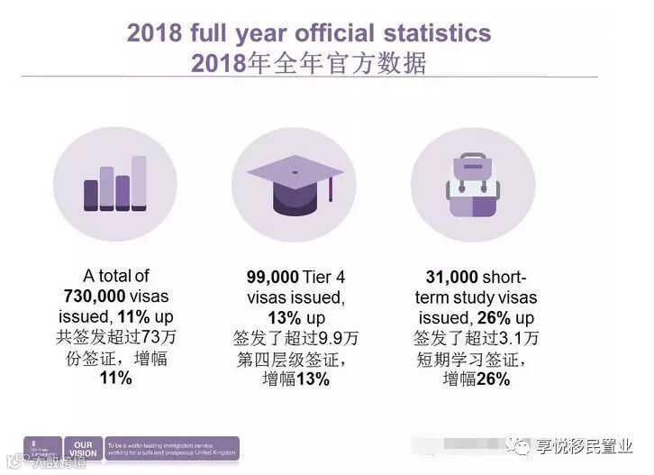 018年UKVI官方签证数据显示,英国签证量保持两位数的增长。2018全年共向中国公民签发超过73万份签证(包括所有签证类别),增幅11%。
