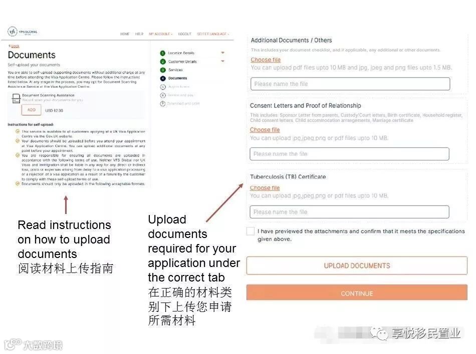 橘红色斜箭头指的是肺结核检测报告上传处,绝大部分第四层级学生都要提交,点选择文件即可上传文件,使用手机或平板电脑都可以操作。上传完后再点continue。特别提示:不是每类材料都需提交,比如Consent letters&proof of relationship(家长同意函和关系证明),18岁以上的学生不需提交此类材料。不涉及提交材料,依然会出现上传的选项,空置即可。
