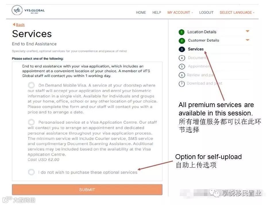 再次提醒,如意签服务或个性化服务有额外收费,选择自己上传没有额外费用。所有签证中心的服务项目都可在第三服务(service)步骤选择并支付。所有付费服务都是自选型服务,非必选项目。若之后想添加某项服务,可以在签证申请中心现场选择和付款。