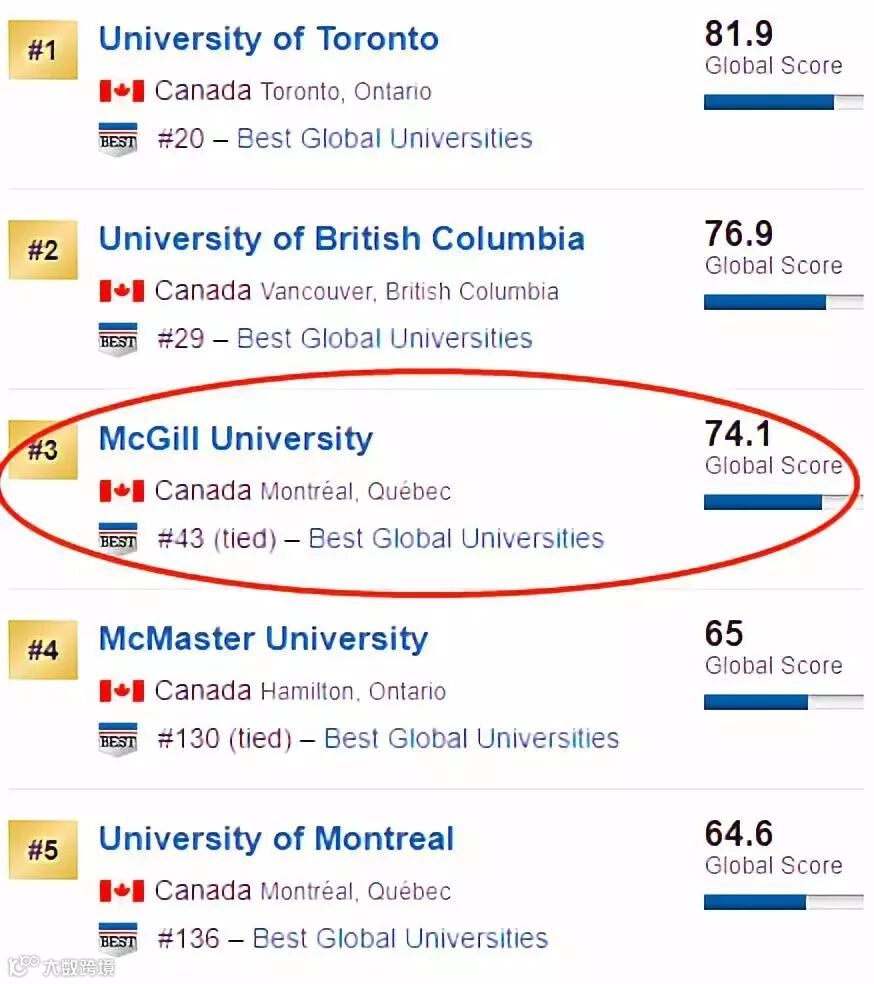 根据美国最具权威和影响力的《美国新闻和世界报道》(U.S NEWS)发布的世界大学排名显示,加拿大麦吉尔大学世界排名第43名。
