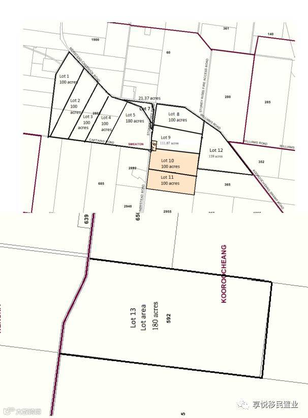 第12块土地的土地面积为159英亩,左侧为NEWSTEAD CRESWICK公路,第11、12块土地以红色划线为边界划分开。(已售)