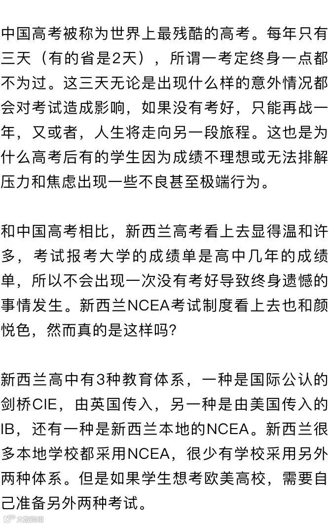 看了新西兰的“高考”制度,感觉哪的孩子都一样,都面临着各种升学考试压力。但是哪一种更有助于孩子今后的学习工作发展,乃至人生规划,我想,看完上面的文章,家长们都会有所思考。