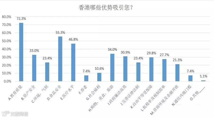 香港吸引移民的优势中,教育质量(72%)占主导优势,其次是食品安全(55%)和第三位是医疗水平(46.8%);资金安全、自由平等和民主法治也是吸引客户的地方,养老和社会福利恰恰不是客户最看重的优势。