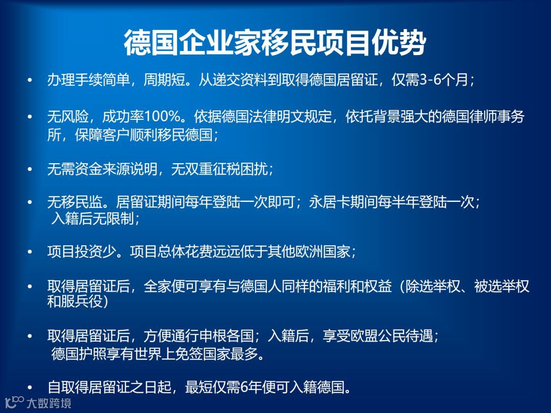 相比其他欧洲国家的移民项目,德国企业家移民项目花费低,办理手续简单,周期短,不需要资金来源审查。没有移民监,居留证期间每年登陆一次;永居卡期间每半年登陆一次即可。德国是由联邦议院制定的移民法,2011年以后才有,而且采取的是联邦制,就是由政府颁发法令,地方政府执行,一切都以地方政府为主,自由度非常大。而我们拥有背景强大的德国本地律师团队,保障您顺利移民德国。企业家移民项目的服务期5年,移民不成功全款可退。