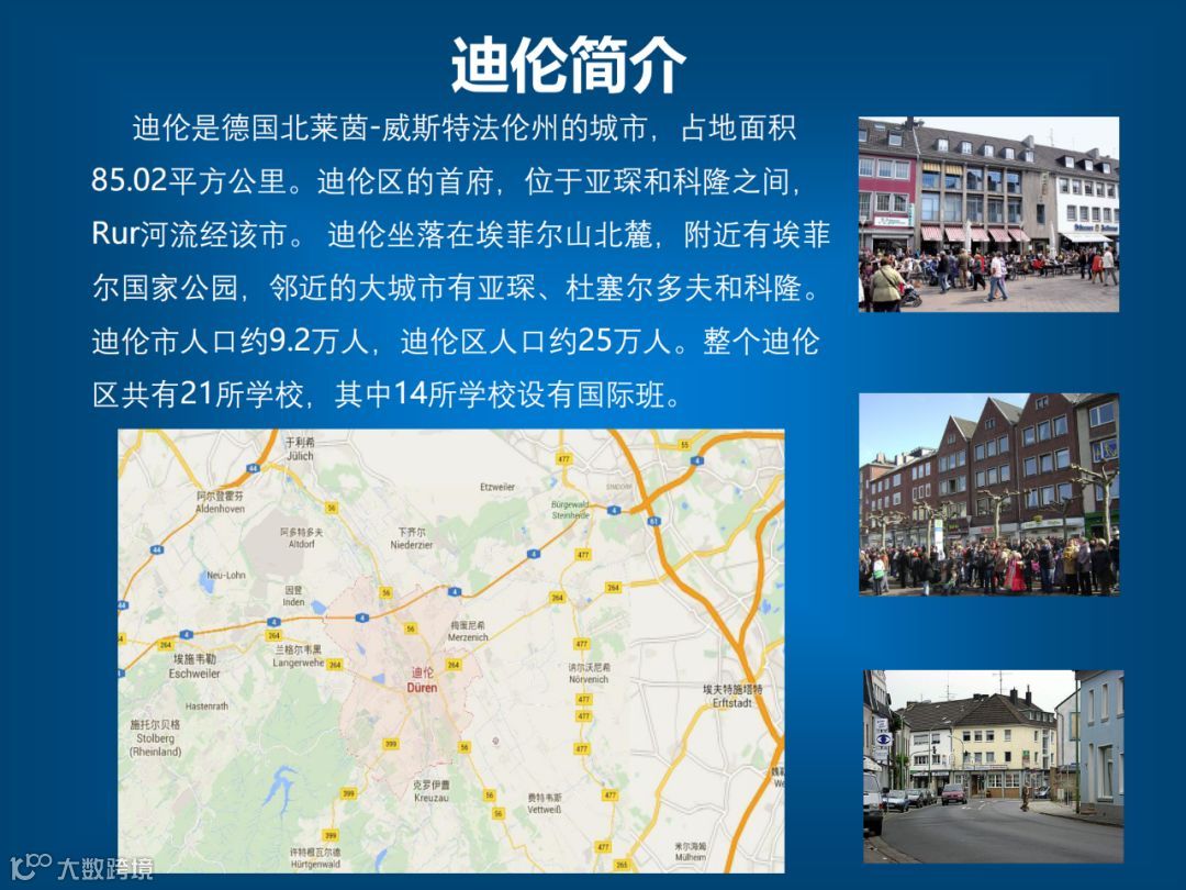 迪伦是一个颇具德国特色的安静城市。位于德国北威州西部,隶属于科隆行政区,距离杜塞尔多夫约40公里,科隆约20公里。迪伦约有27万人口。整个迪伦共有21所学校,其中14所学校设有国际班。