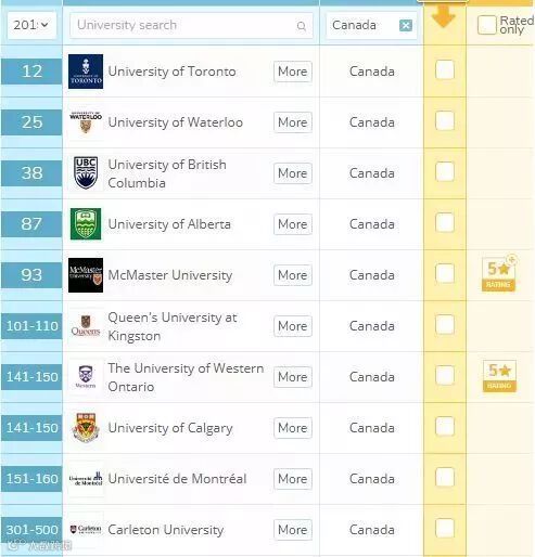 多伦多大学、滑铁卢大学、麦克马斯特大学、萨省大学、布鲁克大学等