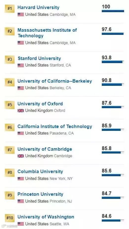 (前十名:哈佛大学,麻省理工,斯坦福大学,加州大学伯克利分校,牛津大学,加州理工学院,剑桥大学,哥伦比亚大学,普林斯顿大学和 华盛顿大学(西雅图))