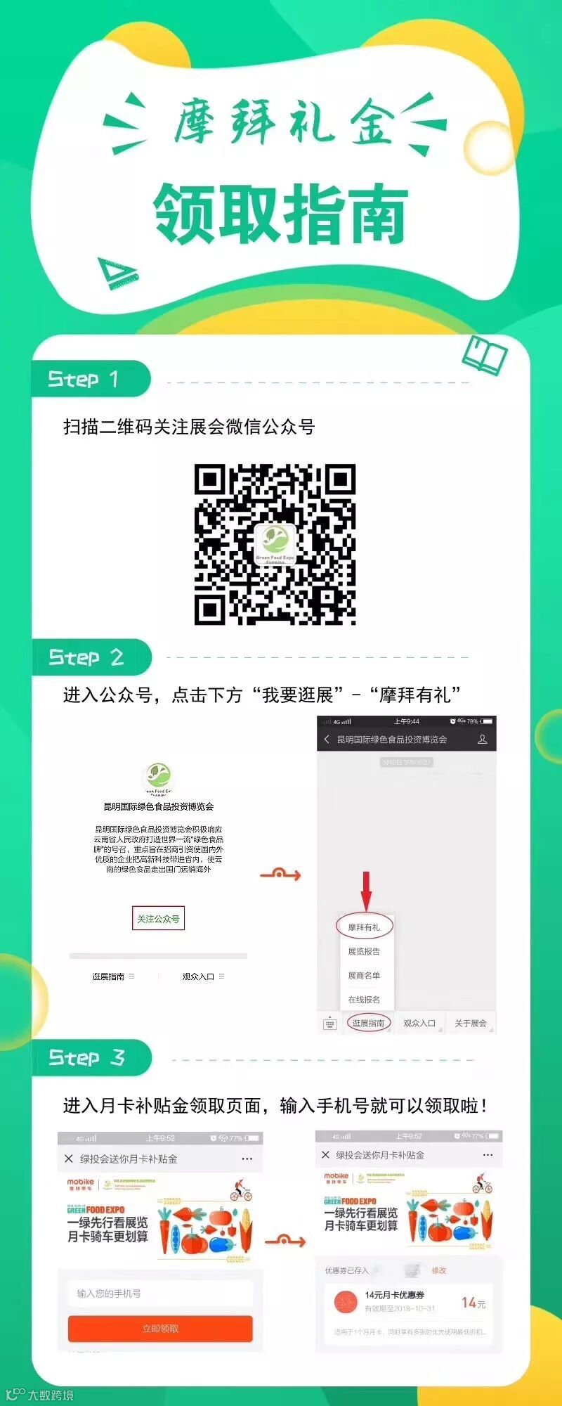 10月12日起,昆明国际会展中心绿投会组委会与摩拜单车共同合作启动了