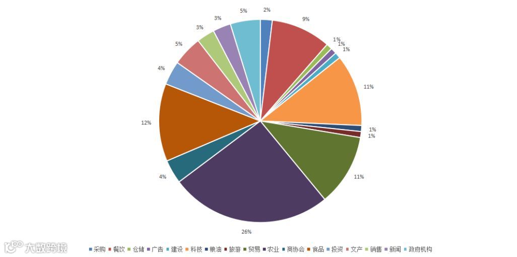 本次展会邀请专业买家涉及17个行业其中农业占26%、餐饮和科技类行业各占12%,贸易类占11%。投资和贸易类行业涉及较少可考虑扩大邀请渠道和力度。