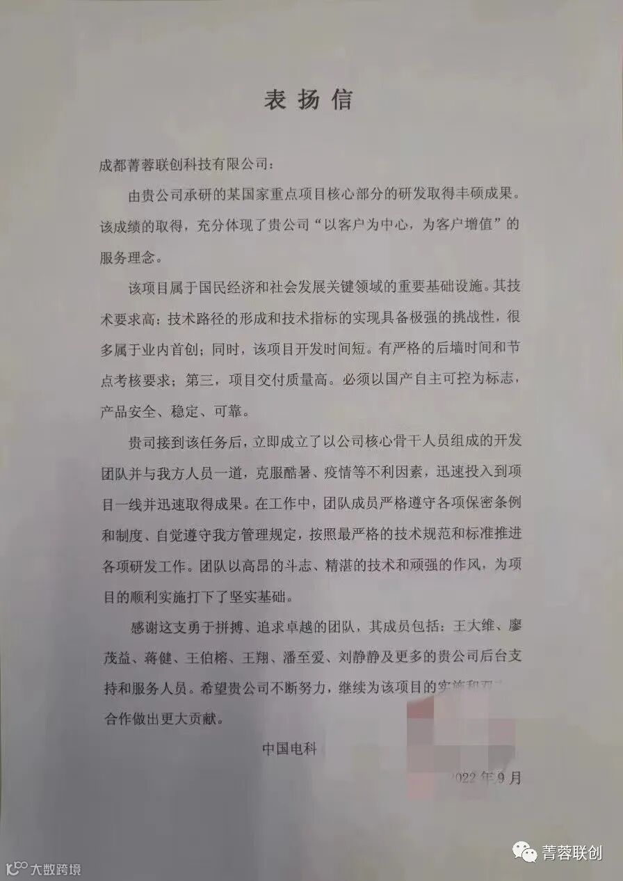 近日,中电科向公司发来表扬信,对我公司承研的《某国家重点项目》核心部分的研发工作成果给予充分肯定,对项目组全体成员的辛勤付出给予表扬。