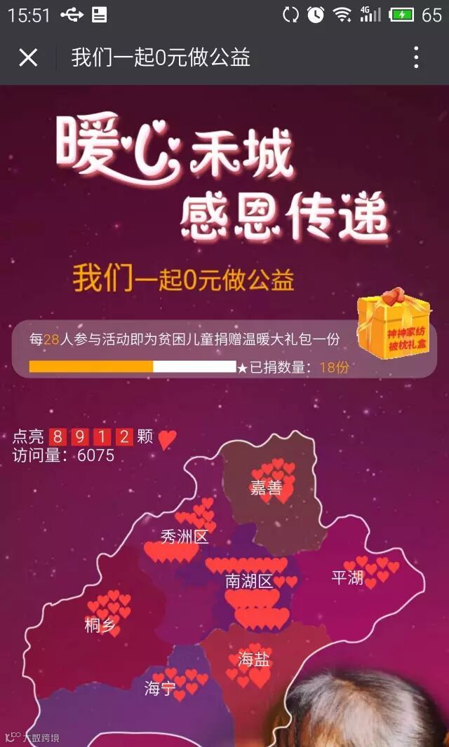 11月20日—12月20日,嘉兴八佰伴在微信公众号开展了“暖心禾城,感恩传递”活动。只需在官微回复“感恩传递”,并在地图上点击所属区域,就可以为区域点亮一颗爱心。他们同时可以成为一名发起者,号召好友共同捐赠爱心。发起者超过28名,就可以为大别山贫困儿童捐赠神神家纺的温暖大礼包(棉絮+被套+枕套+枕头)一份,参与越多,捐赠的温暖大礼包也越多。嘉兴八佰伴同时还为参加活动的爱心人士准备了爱心证书及IPHONE 6sP、购物卡、加油卡等各色礼品,以鼓励更多市民加入公益行列。