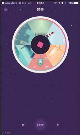静音(iPhone )的主界面是一个大大的播放按钮,拨动转盘可以从森林、小雨、雷雨、钟声、风声和海浪这六种声音素材中切换和组合,形成最适合自己的催眠白噪音。