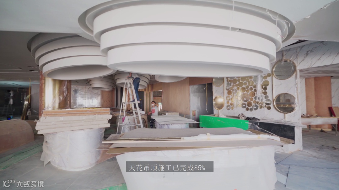 大堂部分的地板施工已完成20%,墙体施工已完成5%,吊顶施工已完成80%,内装施工已完成18%,厕所卫生洁具安装已完成10%。