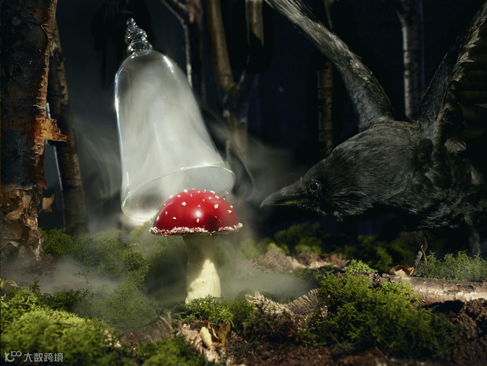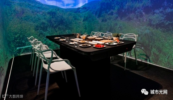 投影投射在空间的每一面墙壁和餐桌上,投影的物体大小和形状会受到餐盘的影响。当将碗碟放在桌子上时,碗碟所包含的风景画面就会散发到桌面和四周。