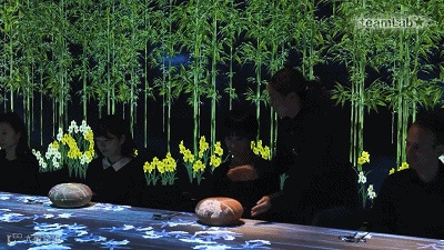 Teamlab创造了一个不断变化的环境,反映日本不断变化的季节。因此,投影也受用餐者的行为影响。如果你保持不动,一只小鸟可能会落在你手上。你突然移动,它会被吓得飞走。