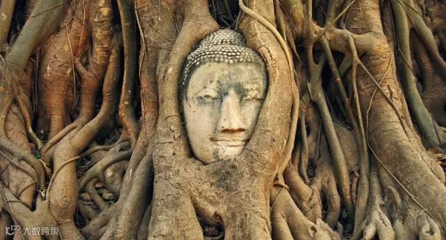 大城标志性景点是「树抱佛头」。缅甸军入侵时大肆破坏,掠走了很多佛头,唯独遗落了这么一颗,佛头和树根缠绵生长,在它的保护下,闭目含笑,走过百年时光。一个不经意的瞬间,就成了永恒。