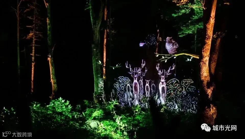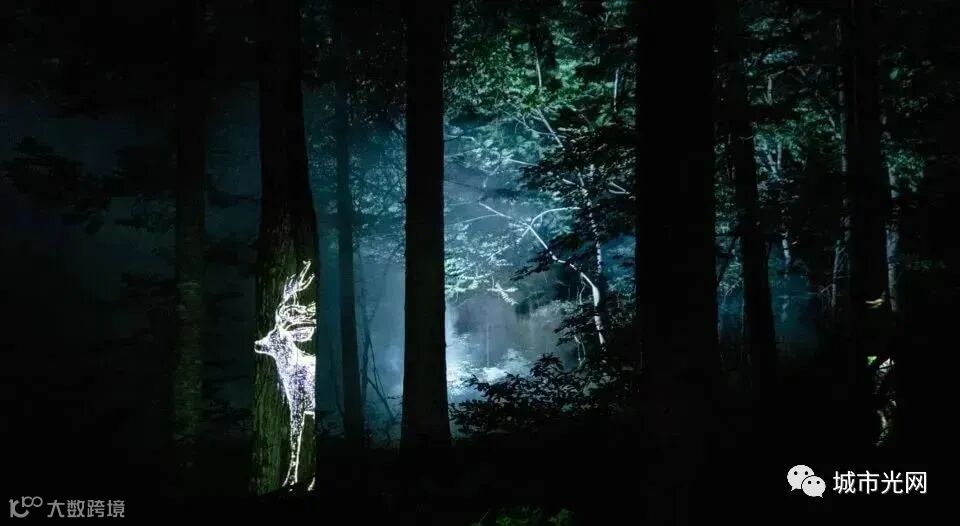 通过全息投影技术、互动装置等,在树林中将诸鸟类和鹿之类的动物投影在森林之中,还原出原本充满生机的森林的样子。