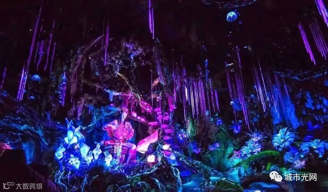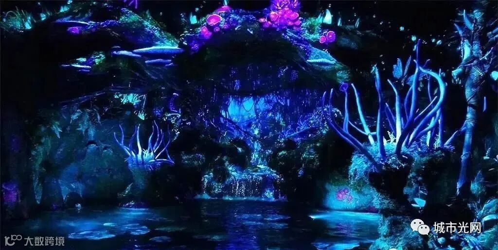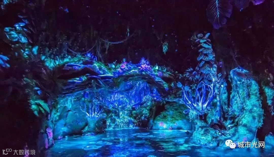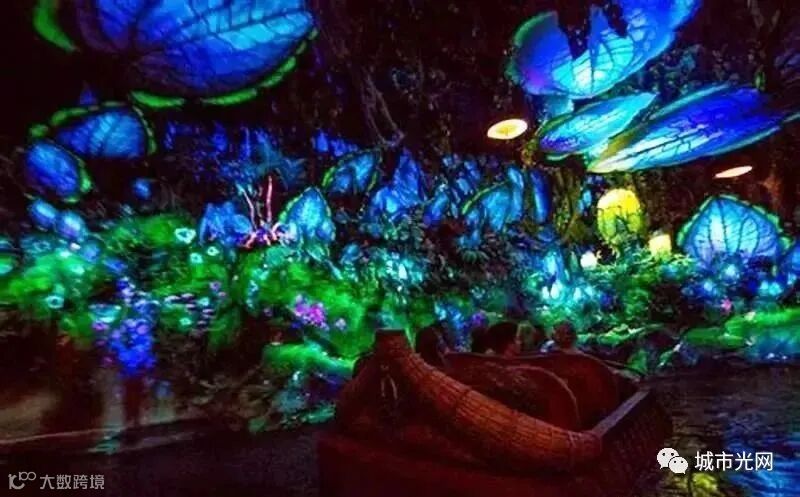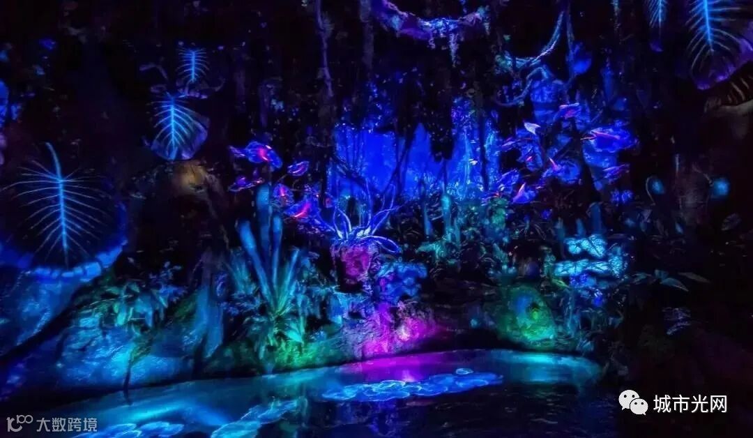 漂浮的水母生物在半空中飞舞,光如跳动的精灵,垂下的藤蔓有光的加入变得栩栩如生,各种肉食动物在远处小跑,甚至有些动物会随着游客船行通过而鼓起他们的羽毛,带给游客身临其境的沉浸式感官体验。