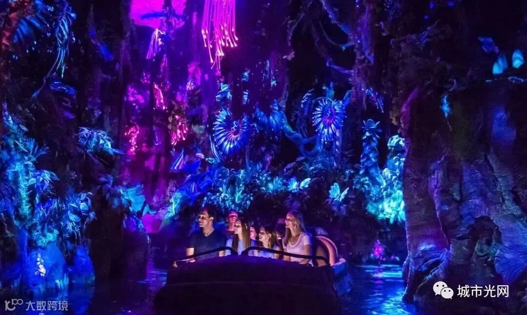 游客们可以乘着独木舟随波漂流,途经潘多拉星球的奇幻森林,还会有神秘的外星生物与游客亲密互动。