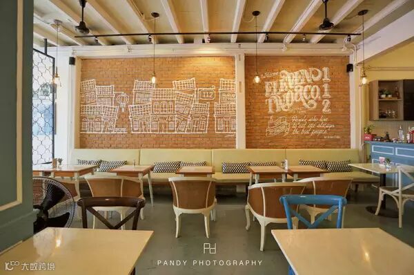 整体的装修风格比较现代,红色的砖墙上画着老街的涂鸦。