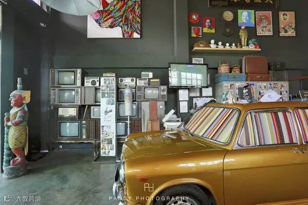 接下来推荐的,是一家复古风格的小店——Chicroom cafe。一台被漆成金黄色的老爷车最先抓住眼球,认真一看才知道这是前台的“特别配备”。前台的上方摆满了后现代风格的艺术品,而另一边则落满了大大小小的古董电视。