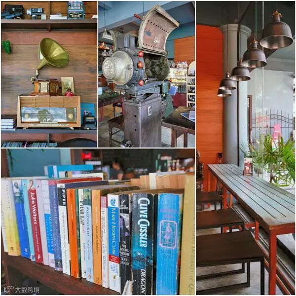 倘若不是像我一样饥肠辘辘的背包客,其实这里也是下午茶的理想场所。整个餐厅是工业风设计,入口处的巨大旧机器、裸露的吊灯、棕色的木质家具,都营造出工业的时尚感。餐厅有两面墙是落地窗的设计,给室内带来充足的采光。另外的墙面被涂成墨绿色,并摆放着巨大的书架带来视觉上的均衡感,古老的留声机好像在诉说着一个遥远的故事……