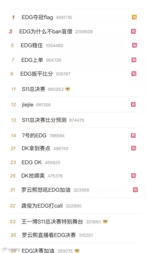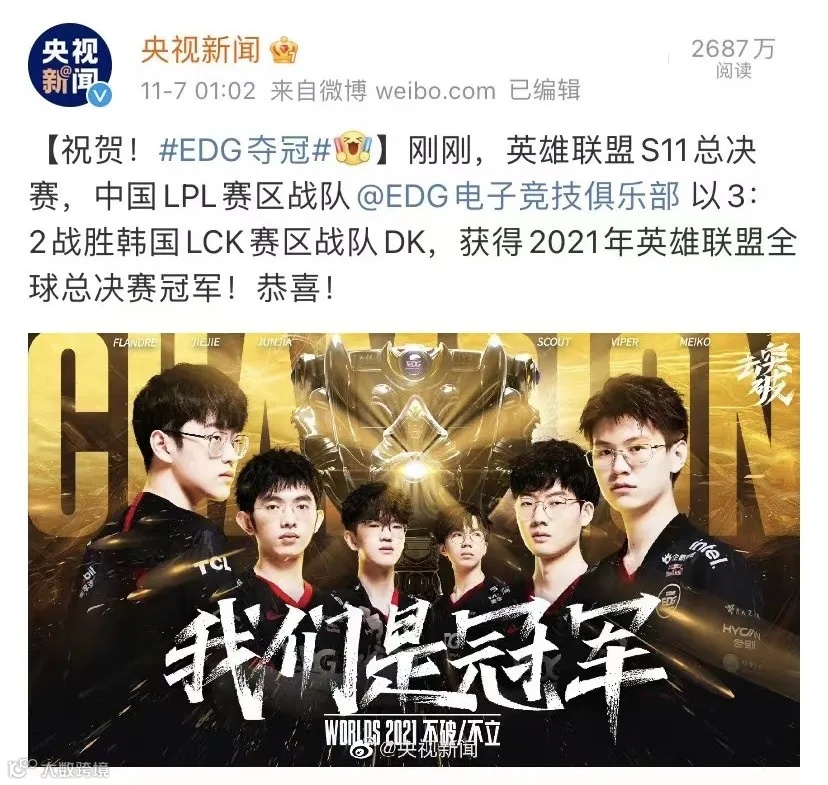 先来说说EDG夺冠, 11月6日晚,中韩两支顶级战队EDward Gaming(EDG)和Damwon KIA Gaming(DK),在冰岛雷克雅未克温泉谷体育大厅角逐英雄联盟S11年度总决赛中,经过激战,EDG战胜DK以3比2的比分取得胜利,捧起了最后的冠军奖杯,夺得了S11的总冠军。它带动了全网沸腾,就连腾讯QQ的服务器都在深夜崩了,微博热搜和首页也被EDG夺冠的消息刷屏,甚至官媒央视爸爸也下场祝贺,而大学校园、直播商业中心如同八十年代的女排夺冠,再次发出时代的呐喊。