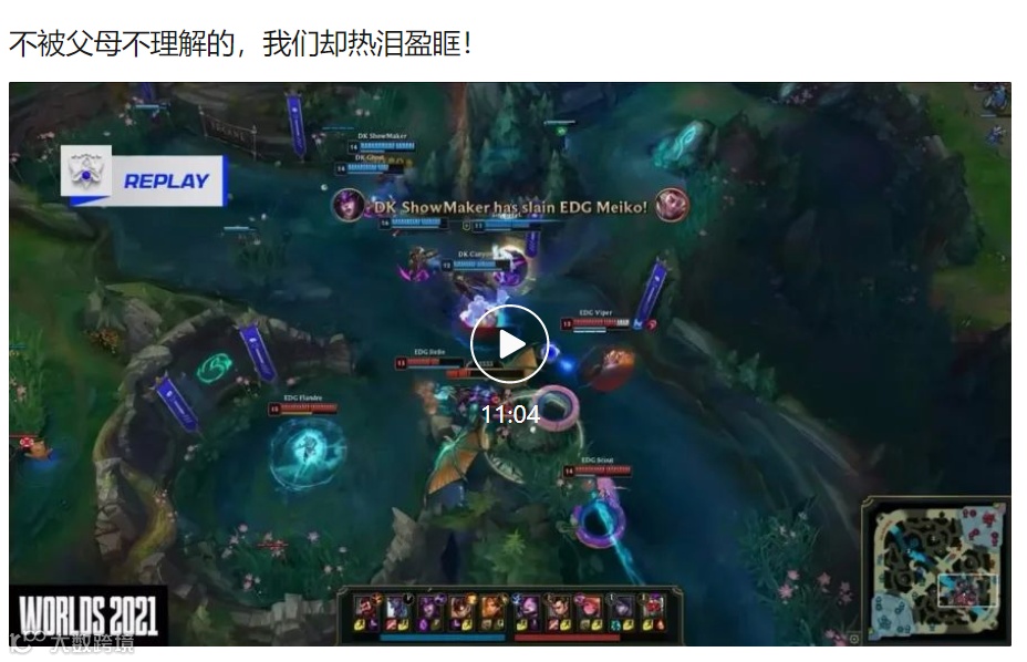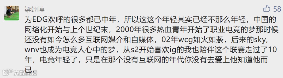 EDG在夺冠的路上真的像一部励志电影。从S4开始至今参加了6场世界赛,前面5场世界赛未能突破八强,一度沦为笑柄,但这次不但突破了8强,直接夺冠。试想曾经年少时期偷偷打游戏被父母和老师反复教育的男孩们,这会儿不光为中国电竞夺冠而骄傲,更为曾经被贬得一文不值的游戏爱好现在终于被主流接纳了,内心被认同的喜悦顷刻间爆发了。