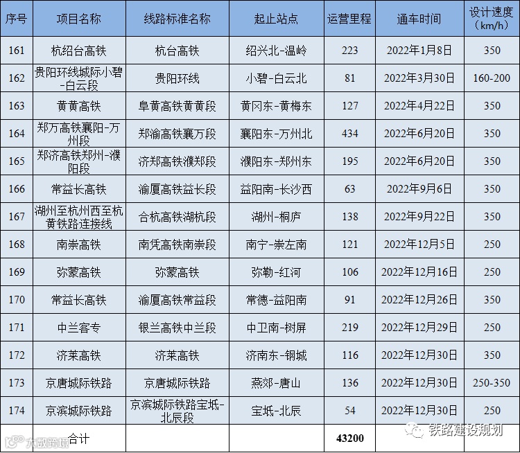 本次更新汇总统计的2022年底高铁运营总里程约4.3万公里,具体线路清单分年度汇总如下: