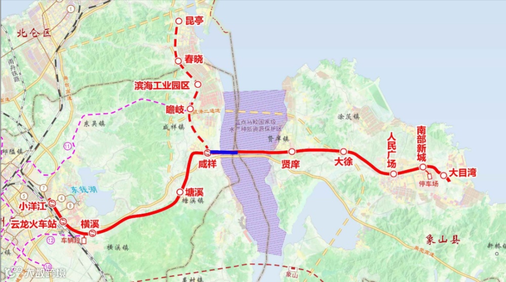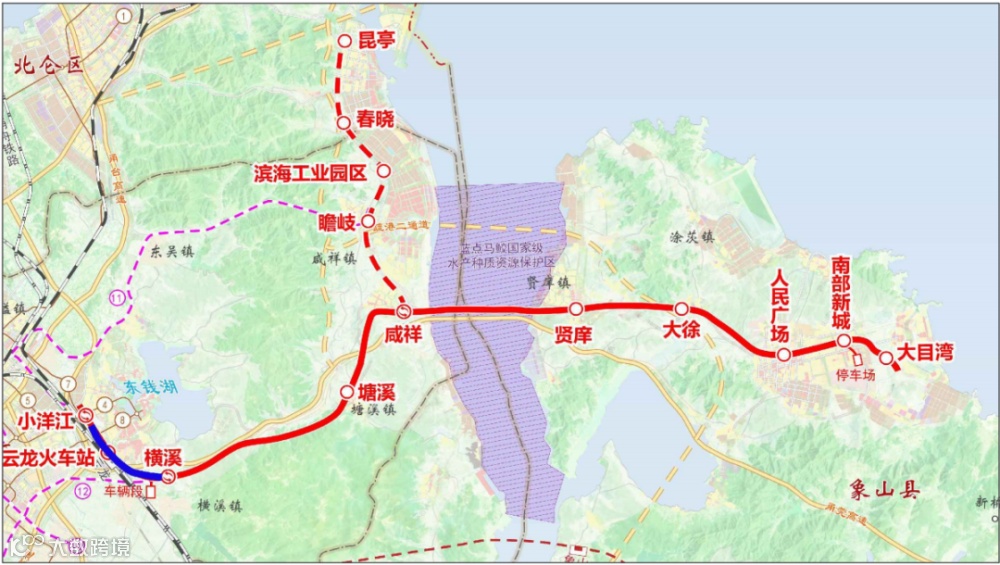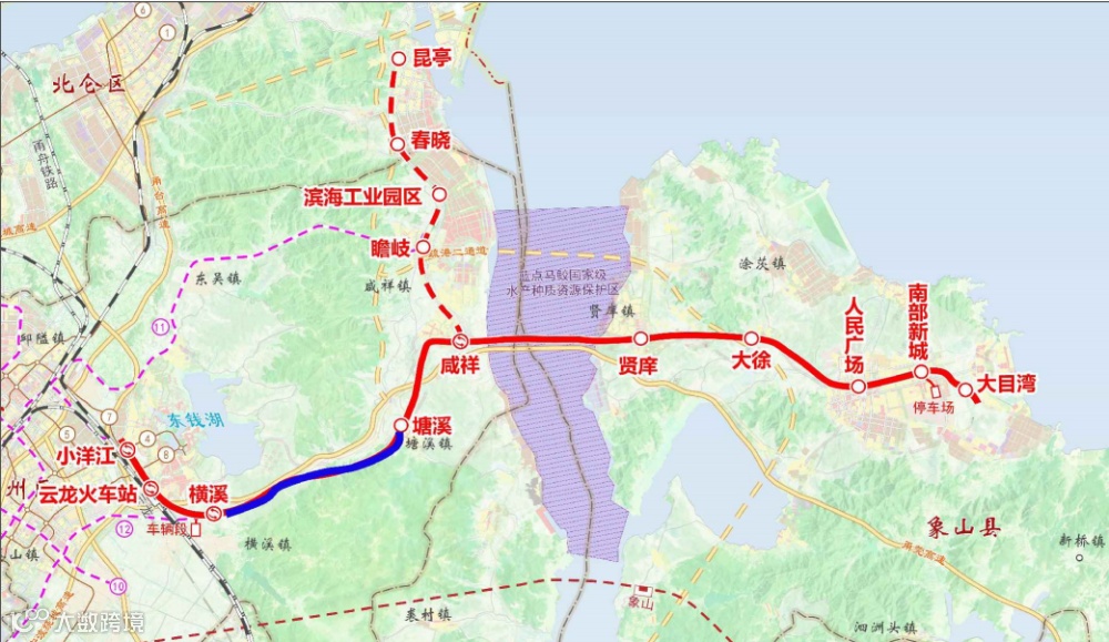 另外,图中还标示了咸祥-瞻岐-滨海工业园区-春晓-昆亭的梅山支线。梅山支线与11号线在瞻岐交汇。