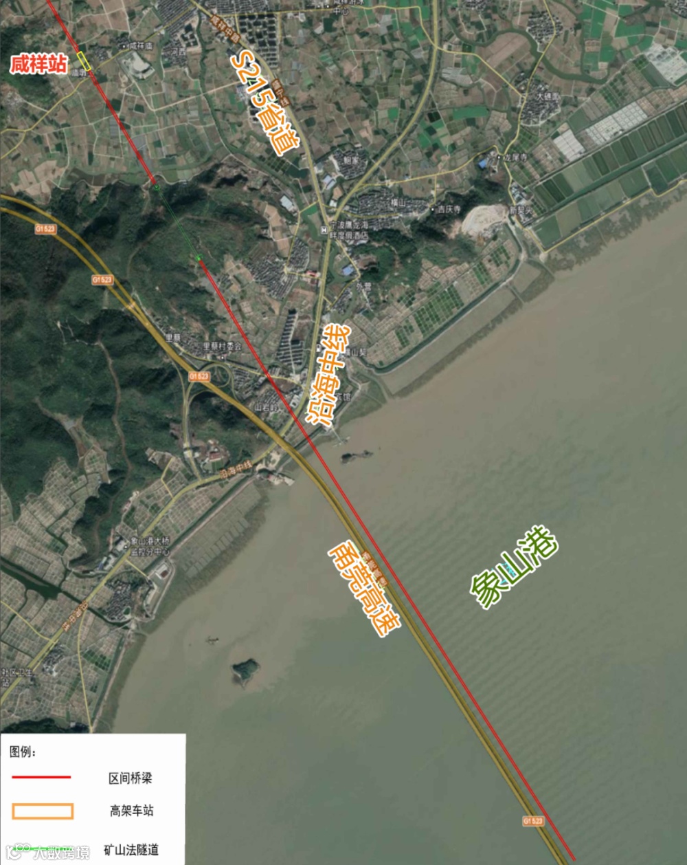 本段线路自咸祥站引出,穿越山体,后上跨沿海中线,沿甬莞高速既有象山港大桥东侧50米(梁面净距)并行跨海,至海域分界处。